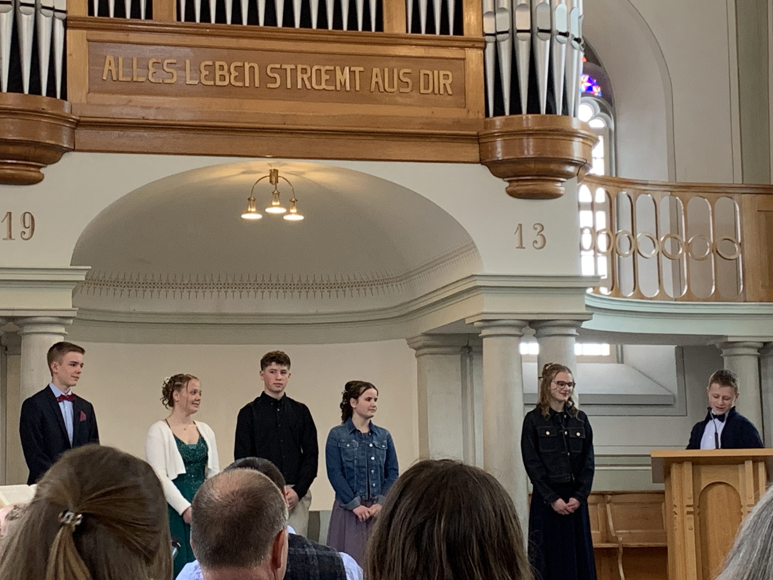 Am Palmsonntag, 29. März 2026 wurden unsere Konfirmanden konfirmiert. Die zahlreiche Kirchgemeinde begleitete die 6 Konfirmanden. Als Säuglinge sind sie getauft worden auf den Namen des dreieinigen Gottes. Im Laufe der Jahre durften sie vielleicht zu Hause und in der Sonntagsschule, bestimmt im Religionsunterricht und zuletzt im Konfirmationsunterricht von ihrem Schöpfer und Retter hören und lernen.